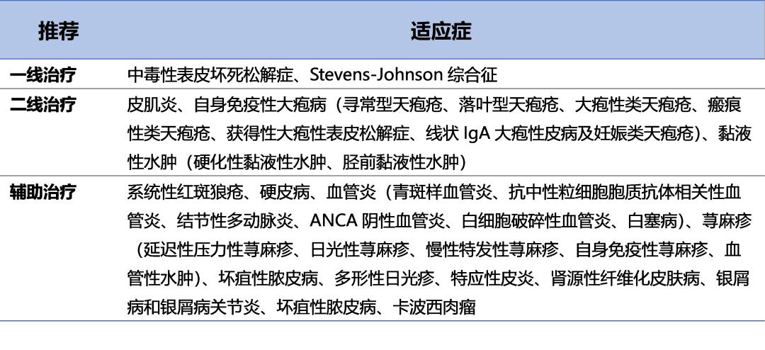 大剂量IVIG可作为单一系统给药治疗TEN,建议联用糖皮质激素和/或免疫抑制剂治疗DM、自身免疫性大疱病、SLE。